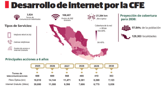 El plan también contempla la expansión de la red de telecomunicaciones para garantizar acceso a internet gratuito en el 97% del territorio nacional, con una cobertura que beneficiará a más de 129 mil localidades adicionales.