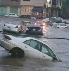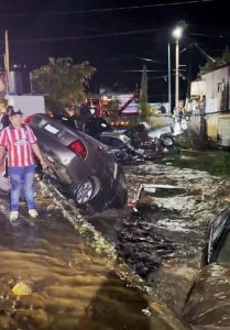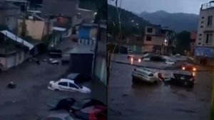 Videos y reportes compartidos por los residentes en redes sociales muestran automóviles volcados en las calles del municipio después de ser arrastrados por la fuerte corriente del río.