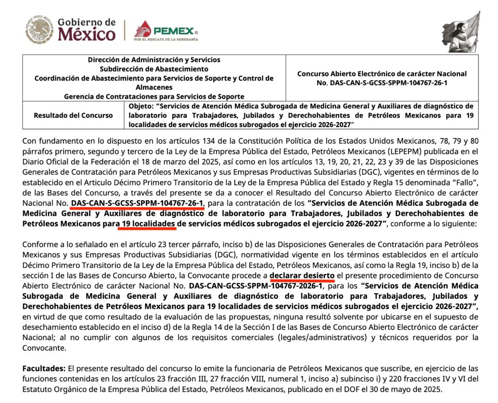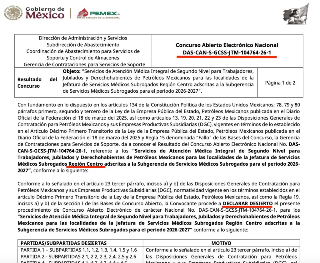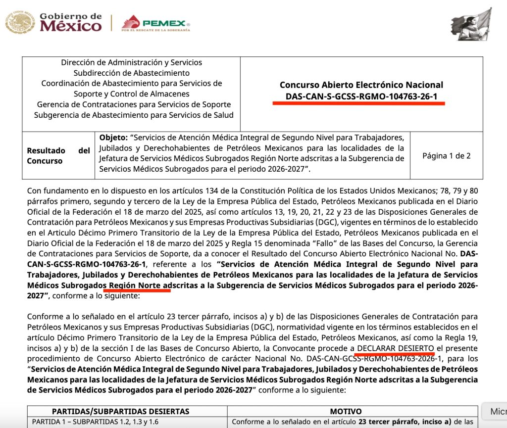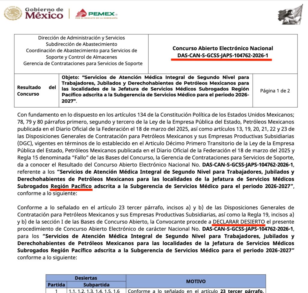 A pesar de que la Subdirección tiene en puerta diversos procesos para la contratación de servicios médicos subrogados -vitales para atender aquello que la infraestructura propia de Pemex ya no puede cubrir-, extrañamente 4 de las 6 convocadas, han caído en el mismo vacío legal: son declaradas desiertas.