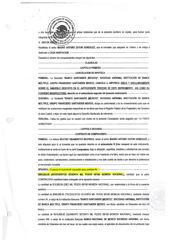 El monto declarado para dicha operación fue de 2 millones 500 mil pesos, los cuales fueron pagados en una sola exhibición con una transferencia de Banamex a Santander.