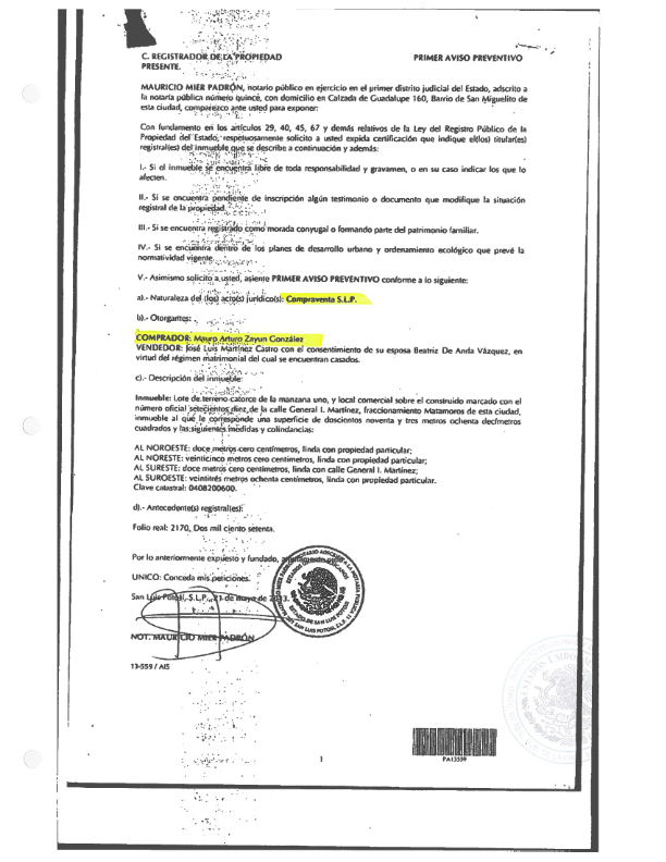 En todas sus adquisiciones Zayún González presenta patrones comunes que generan sospechas de simulaciones, entre ellos el uso reiterado de las notarias públicas 21 y 23 de San Luis Potosí, pagos en efectivo, cheques sin respaldo crediticio, posible subvaluación y registro de donaciones entre sus familiares.