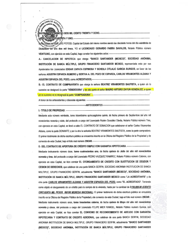 El 23 de diciembre del 2013 compró un inmueble con una superficie de 300 metros cuadrados en Villas del Pedregal, San Luis Potosí, por un monto declarado de 960 mil pesos que fue pagado con dos cheques, el Santander Número 002316 por 560 mil pesos y el Banamex Número 001426, por 460 mil pesos.