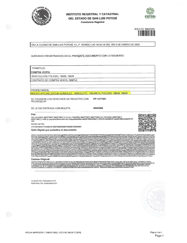 Documentos del Registro Público de la Propiedad muestran que entre 2012 y 2025, Zayún González, adquirió al menos seis bienes inmuebles a su nombre, cinco en San Luis Potosí y uno en Playa del Carmen, Quintana Roo, con un valor declarado de 13 millones de pesos, pero con un valor estimado en poco más de 70 millones de pesos.