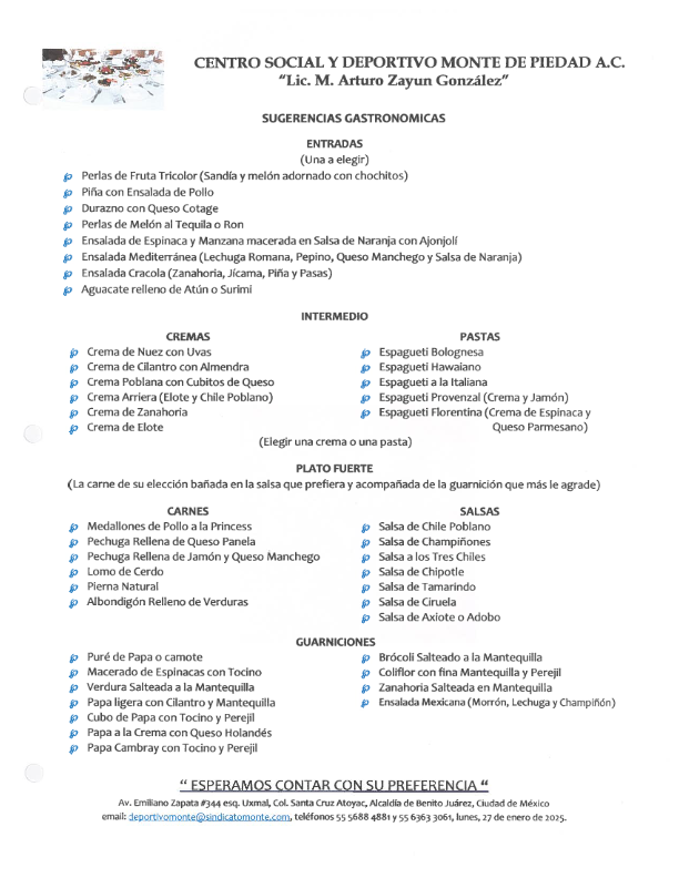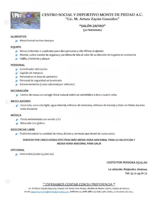 Para la investigación se realizó una visita al lugar para solicitar informes sobre la renta del salón. Una vez que Jiménez Pérez dio toda la información y mostró fotografías de eventos anteriores, se dio un anticipo para apartar el lugar y el administrador entregó un recibo a nombre del Centro Deportivo y Social Monte de Piedad.