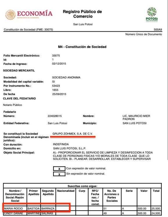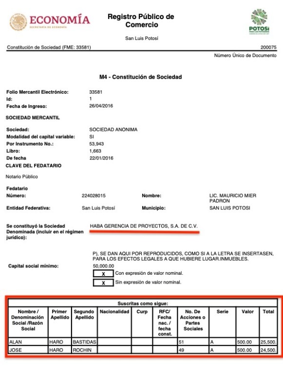 De acuerdo con los registros oficiales de ambas empresas, los socios de la empresa Haba Gerencia de Proyectos son José Haro Rochin y Alan Haro Bastidas; mientras que la principal socia o la accionista mayoritaria de Grupo Zohmex es María Rocío Bastidas Barraza, esposa de José Haro Rochin y mamá de Alan Haro Bastidas.